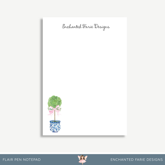 Chinoiserie Topiary Notepad – Elegant Blue & White Stationery with Pink Bow
