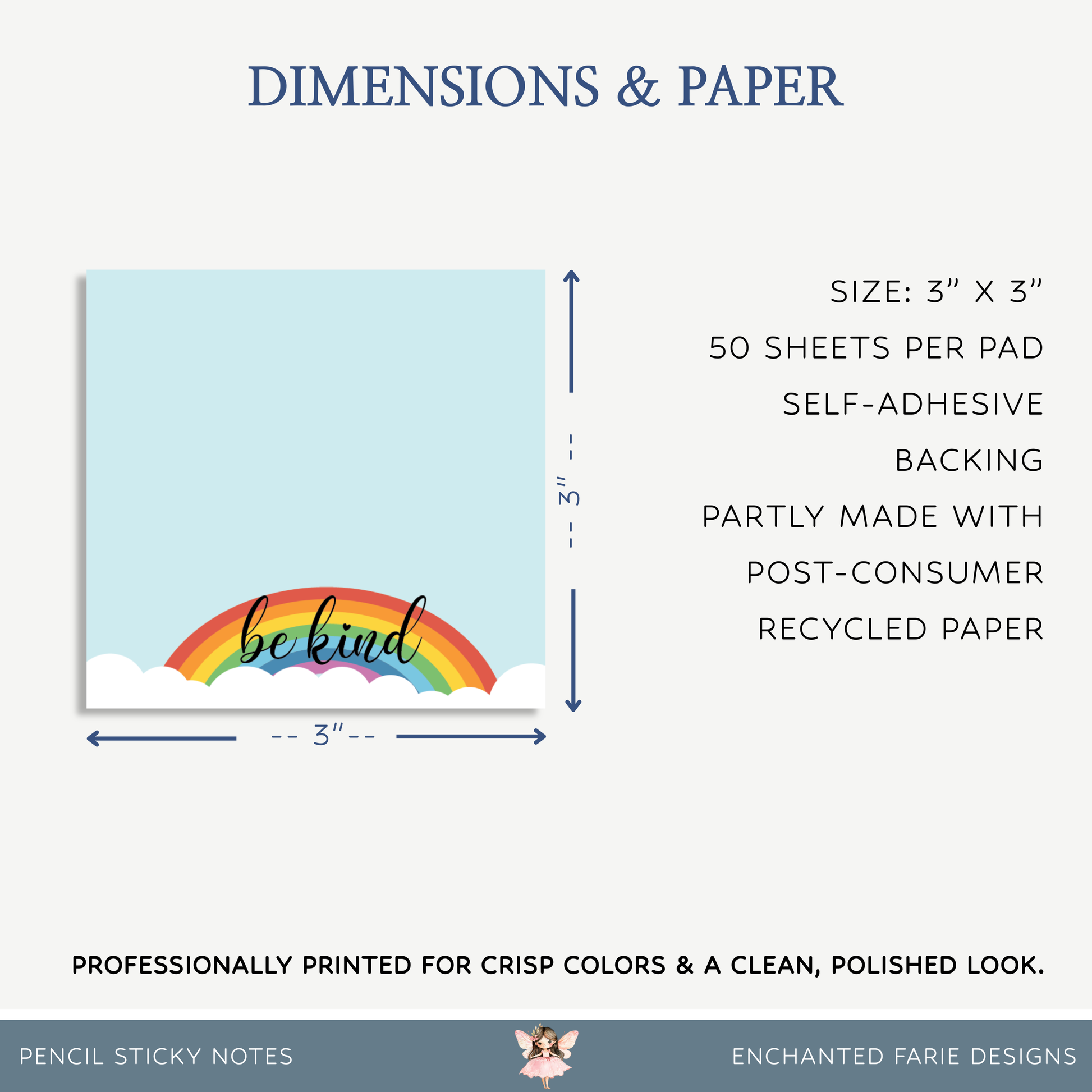 Bring a little sunshine to your day! These cheerful 3x3" sticky notes feature a bright rainbow and “Be Kind” reminder, perfect for teachers, students, or anyone who loves spreading positivity. Professionally printed with crisp color and a smooth finish, each pad features 50 self-adhesive sheets, partially made from recycled paper.