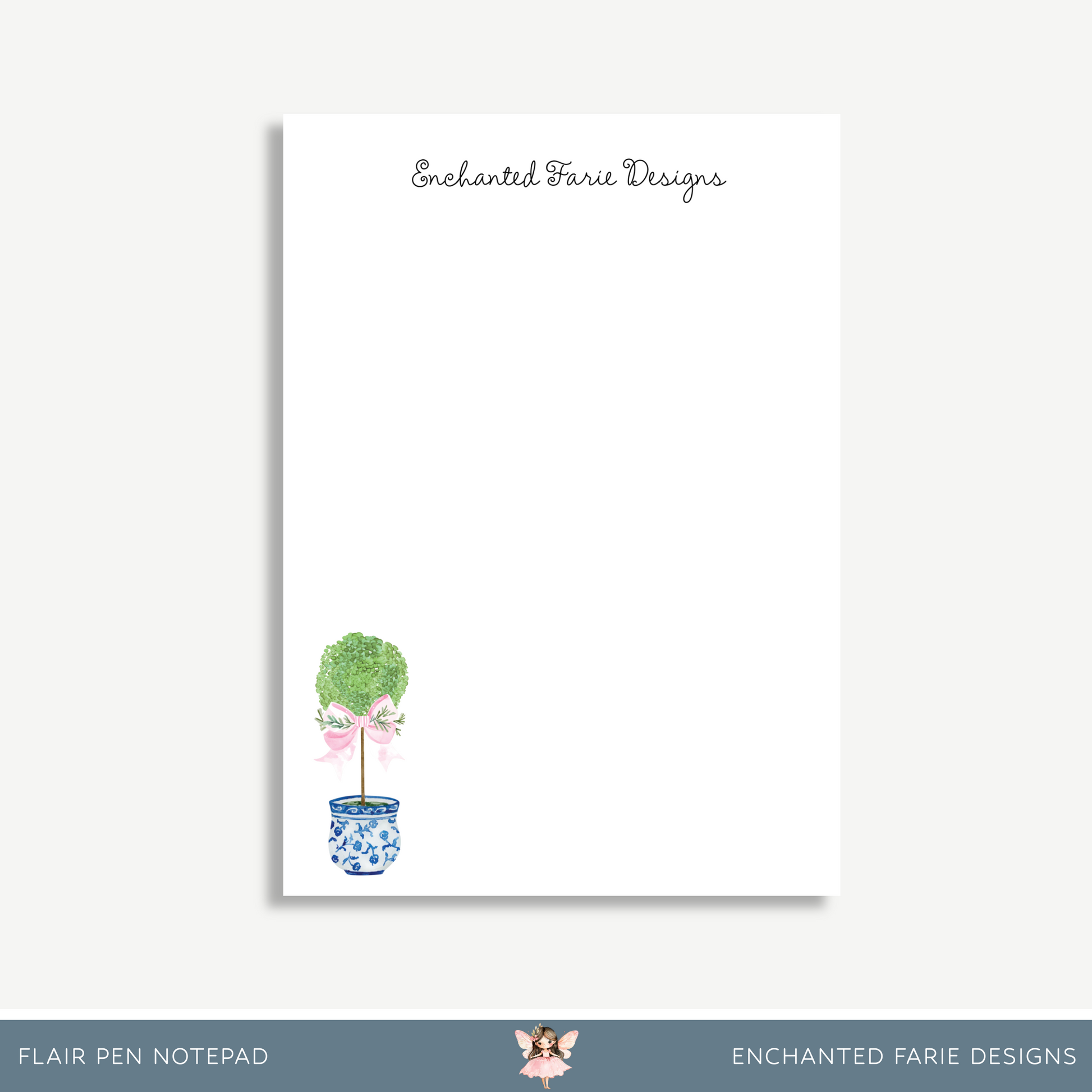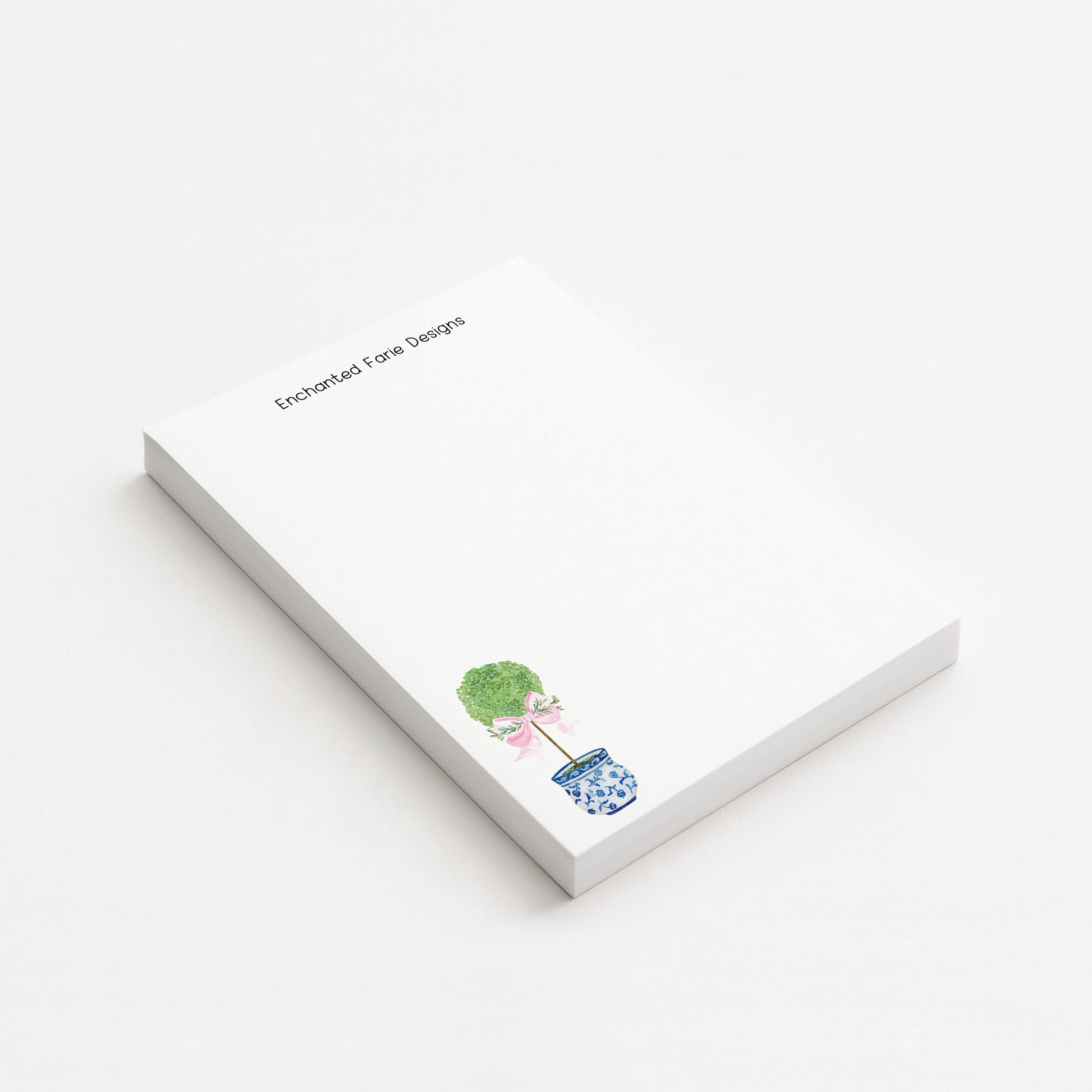 Bring charm to your desk with this elegant Chinoiserie notepad featuring a hand-painted topiary in a blue & white vase with a soft pink bow. Perfect for daily notes, lists, or thoughtful gifts, this timeless stationery piece blends classic style with everyday function.
