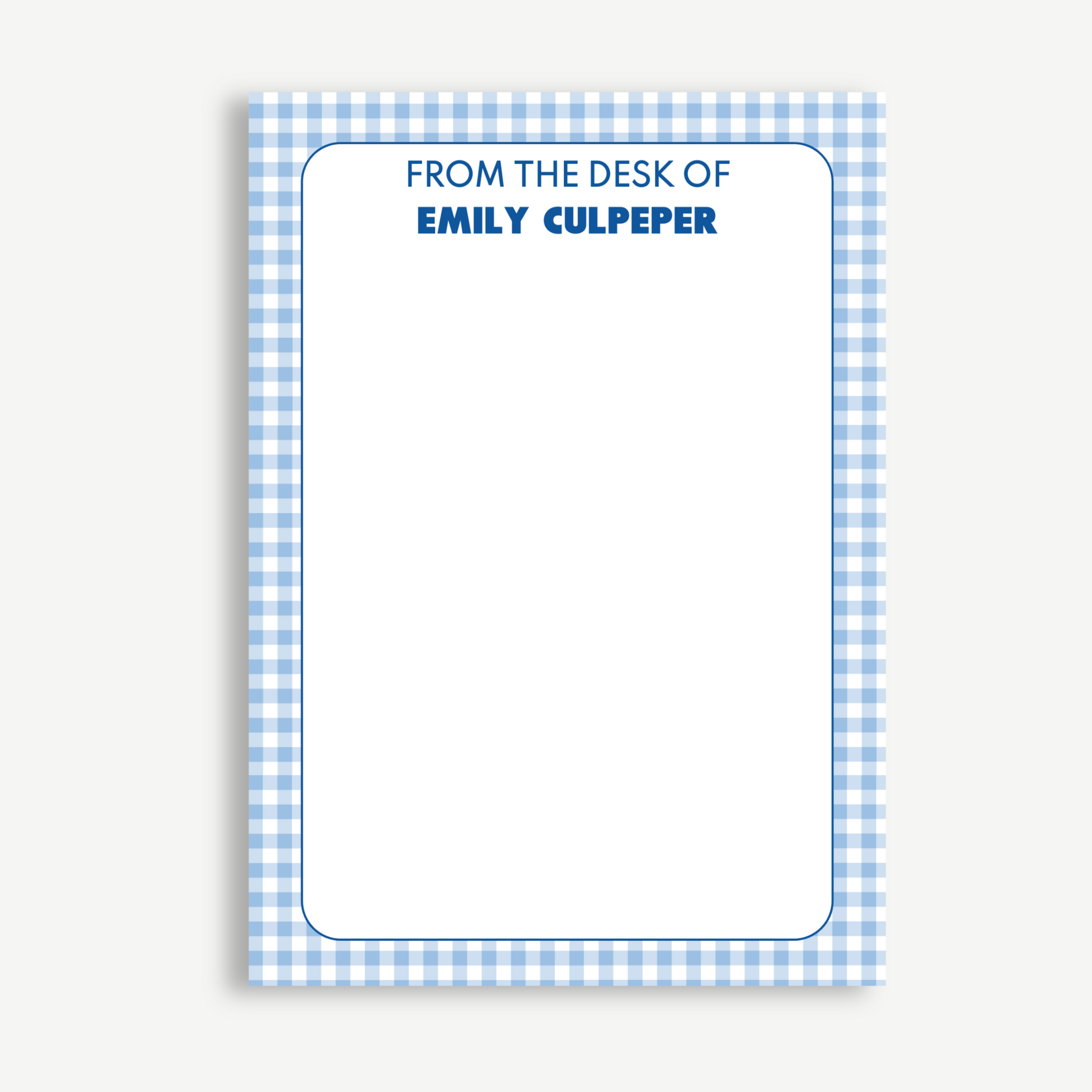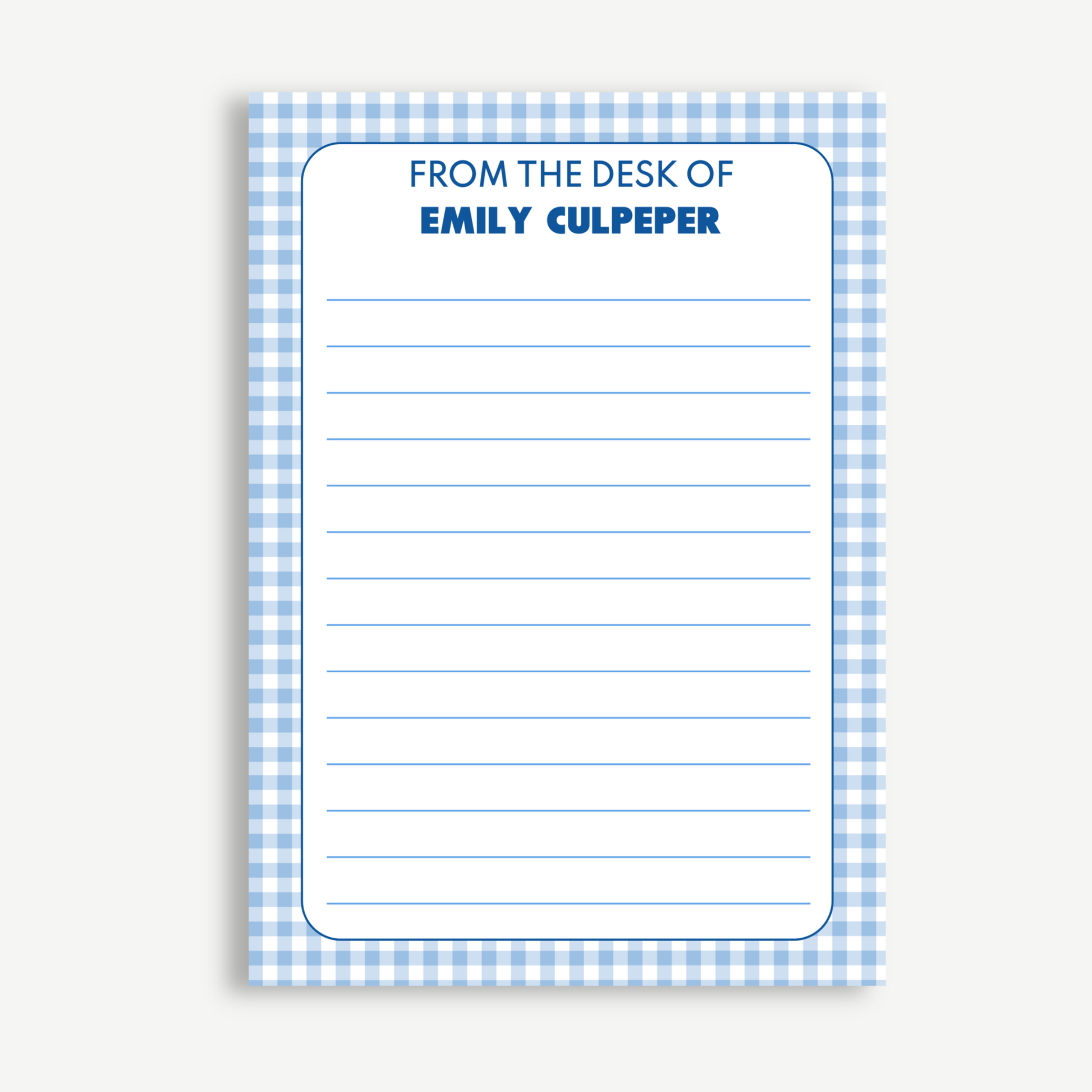 Add timeless charm to your desk with this classic gingham notepad! Featuring a crisp blue and white gingham design with the option to personalize it with your name, this notepad brings a touch of elegance to everyday notes.