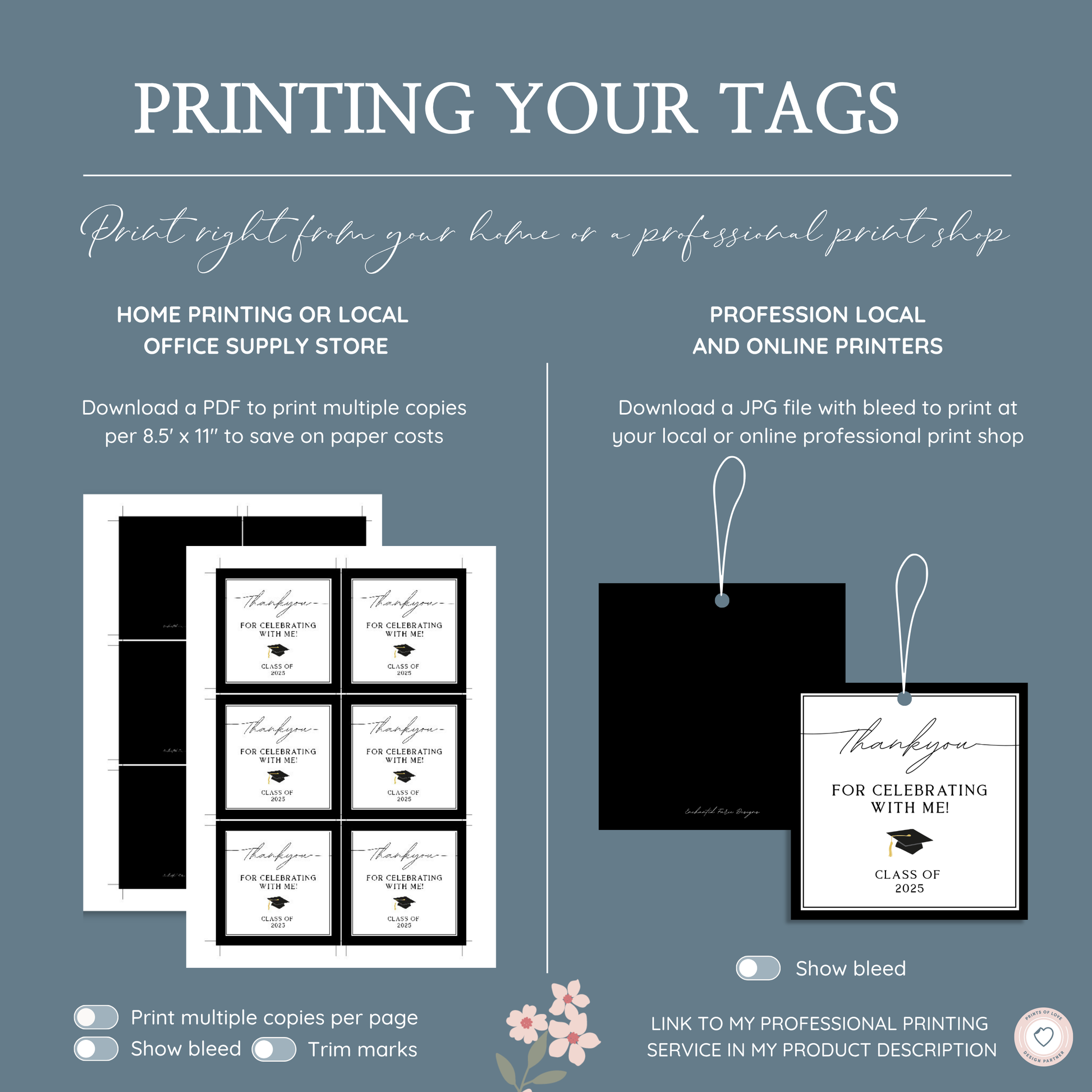 Say thank you in style with this elegant 3x3" printable graduation favor tag! A timeless design featuring script and a graduation cap—perfect for party favors or treats.