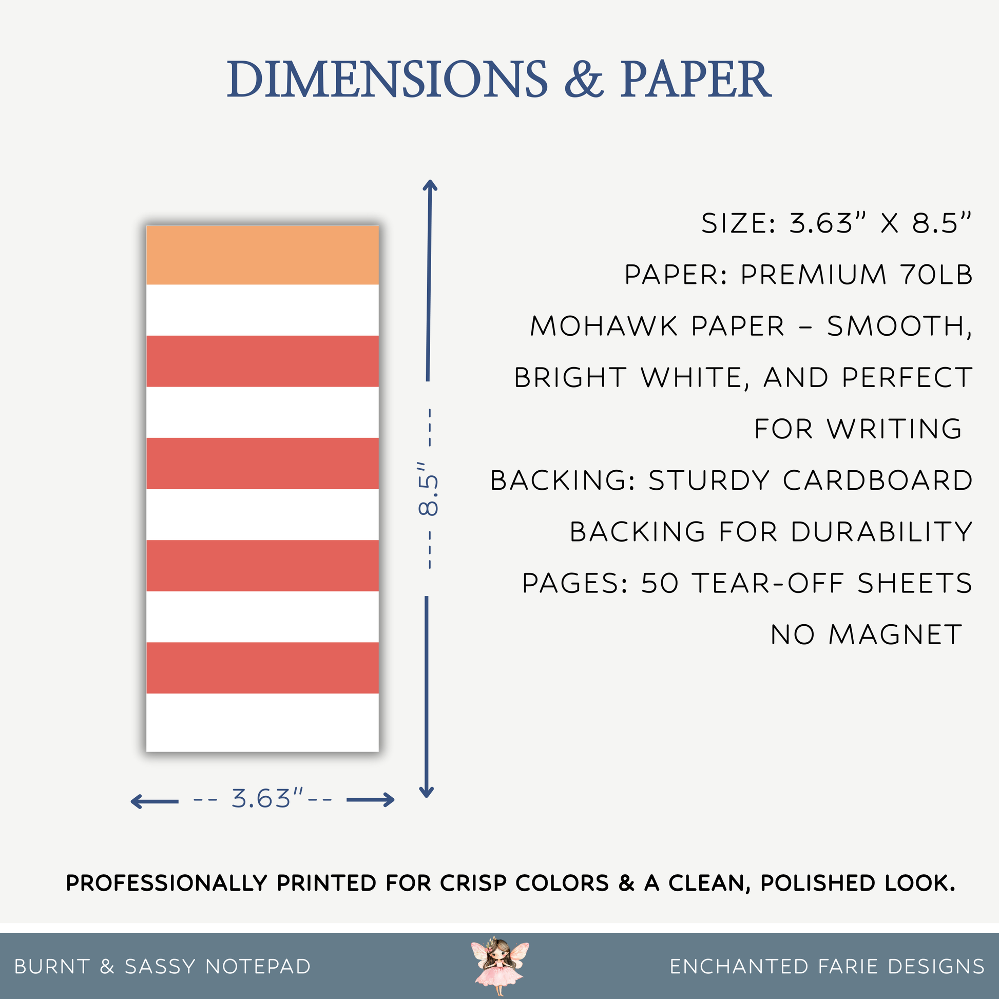 Bring a fresh, modern touch to your daily notes with this coral striped notepad. Designed to be both functional and stylish, this notepad is perfect for jotting down to-dos, reminders, lists, or quick thoughts throughout the day.