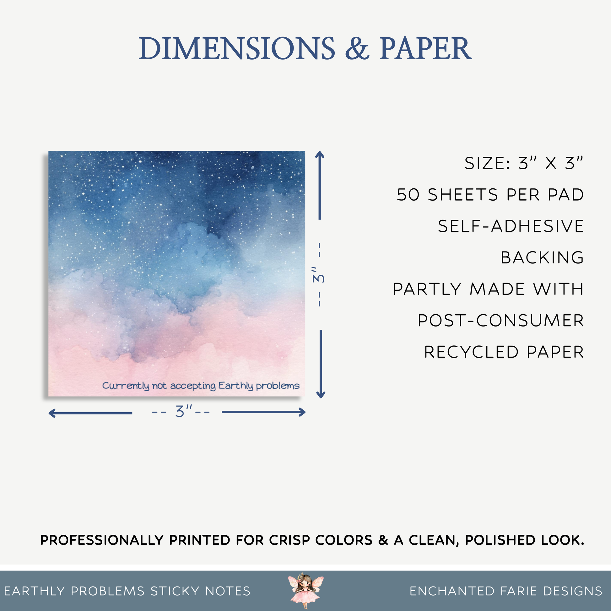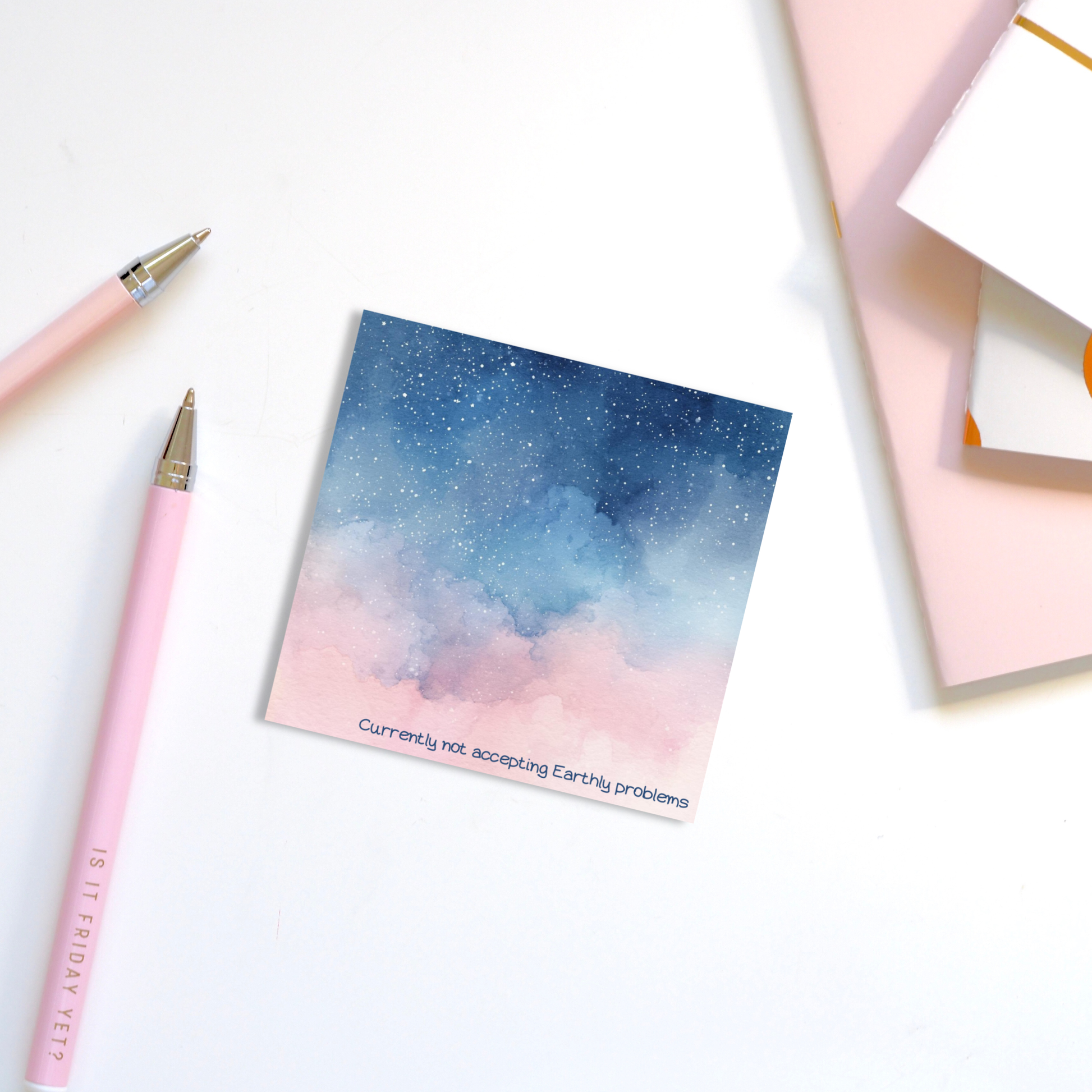 When life feels a little too Earthly, escape to the stars with these celestial sticky notes! Featuring a dreamy watercolor galaxy of blues, pinks, and purples - and the perfectly sassy phrase, “Currently not accepting Earthly problems.”