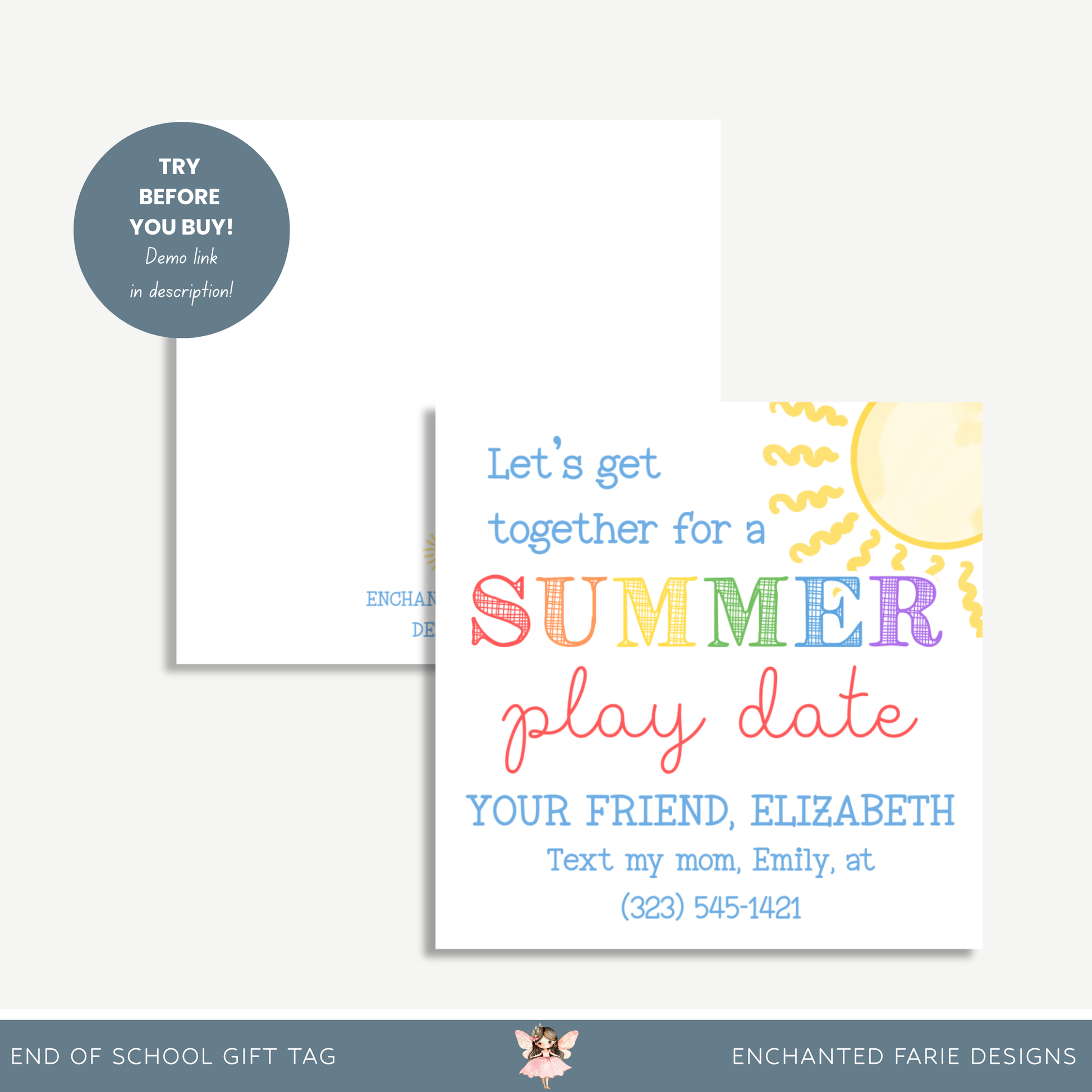 Make it easy (and adorable!) for kids to stay connected with this Summer Play Date printable tag! Featuring a bright sun, rainbow lettering, and sweet handwritten fonts, this 3x3” tag is perfect to attach to end-of-school gifts, class favors, or party bags.