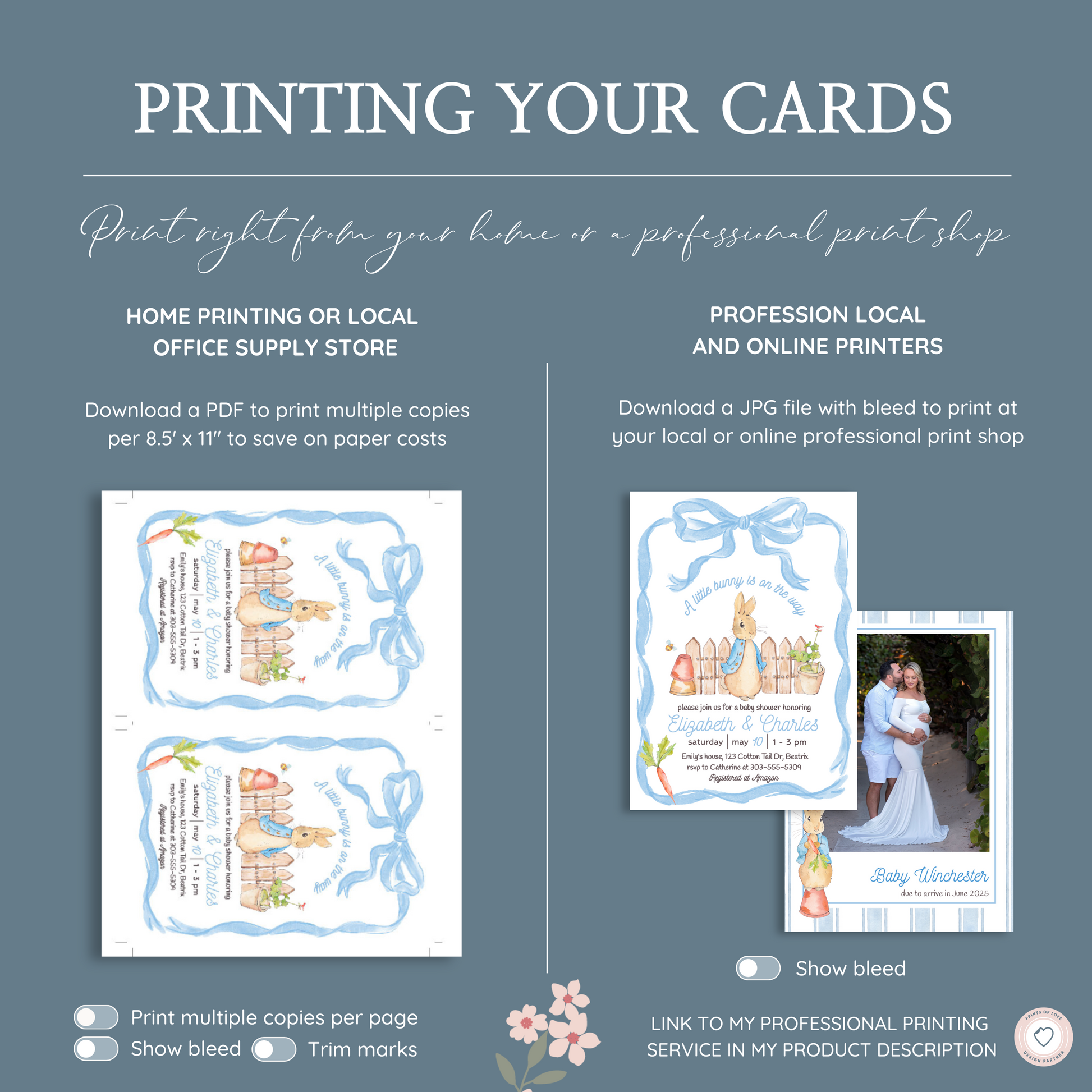 1. Print at Home or a Local Print Shop - For the best results, Use high-quality cardstock (80# or heavier). Popular print shops like Staples or Office Max can also handle your printing needs.