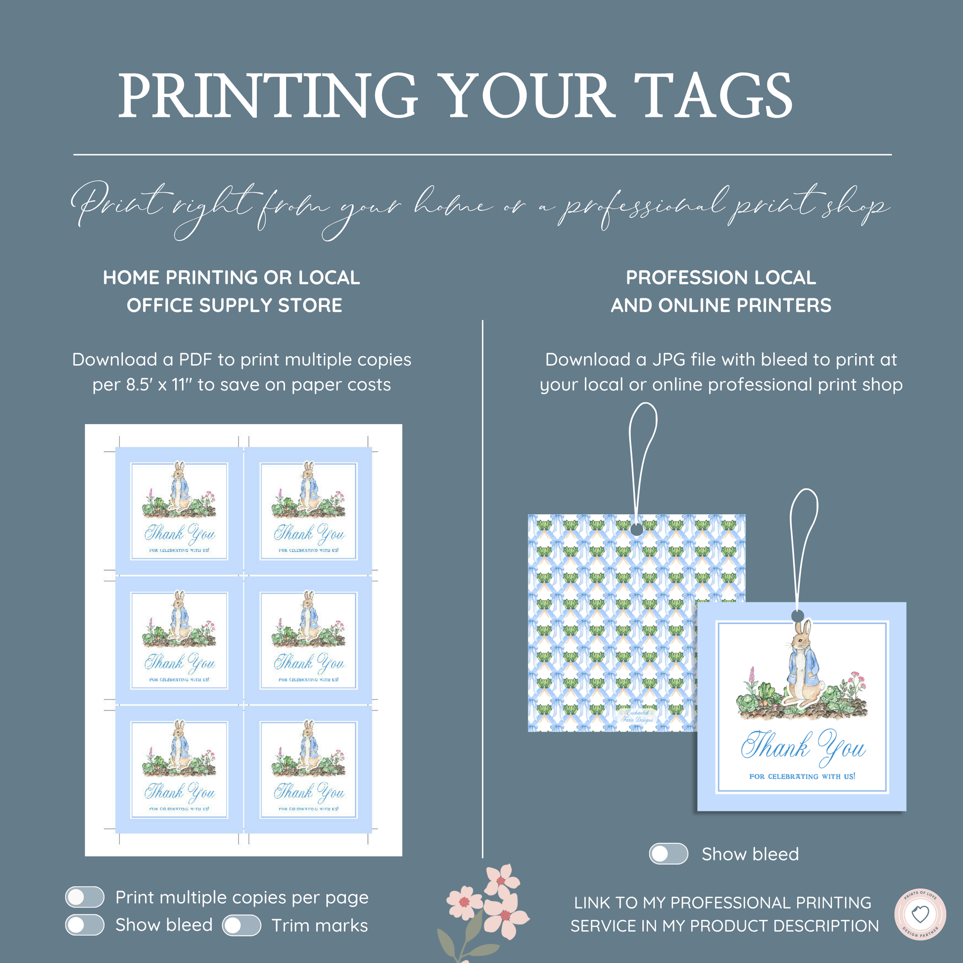 Add a charming touch to your celebration with this 3x3" Peter Rabbit-themed thank you tag! Featuring a watercolor illustration of Peter Rabbit in the garden and an adorable carrot bow pattern on the back, this tag is perfect for baby showers, spring parties, or classic birthday themes. Print at home or with your favorite print shop to create the sweetest favor tags for your guests.