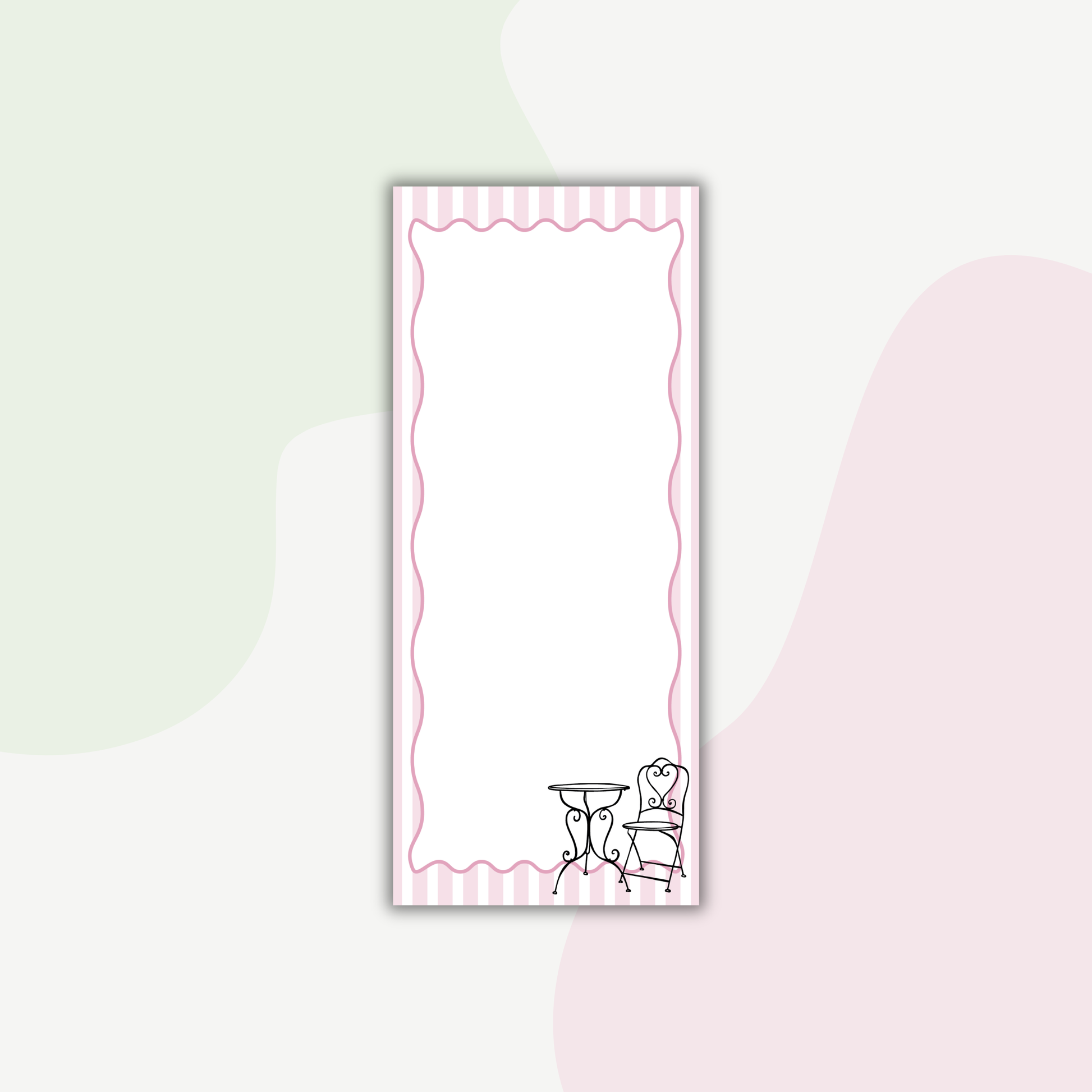 Add a little European charm to your everyday lists with this pink striped bistro notepad, inspired by cozy Parisian cafés and slow, beautiful moments. Featuring soft blush stripes, a scalloped writing frame, and a delicate café table illustration, this notepad turns daily to-dos into something truly delightful.