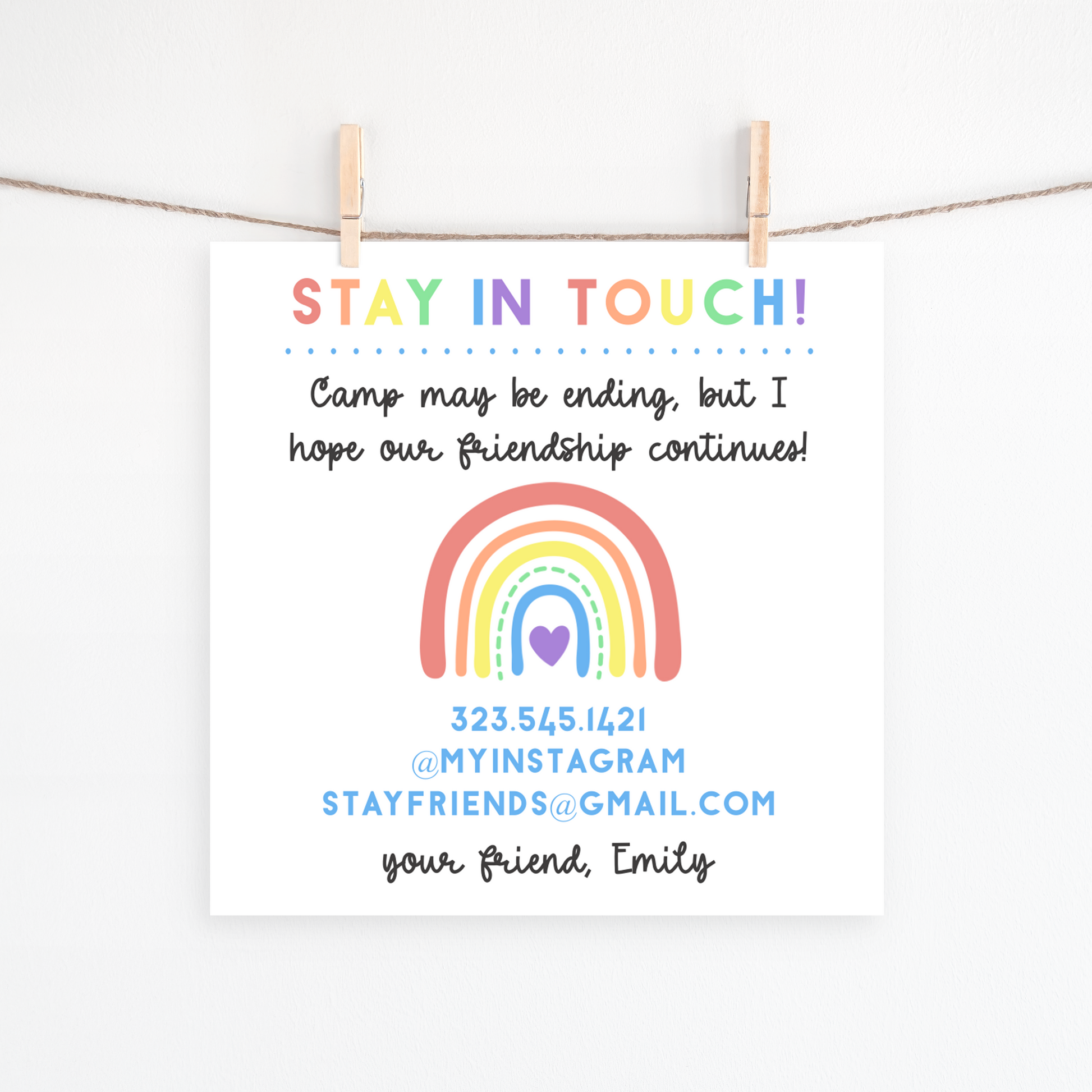 Camp may be ending, but the friendships don’t have to! This cheerful Stay in Touch card is the perfect way for kids to exchange contact info and keep summer memories alive. Featuring a sweet rainbow design with space for phone, email, and social media, it's a thoughtful way to say goodbye (for now) and stay connected.
