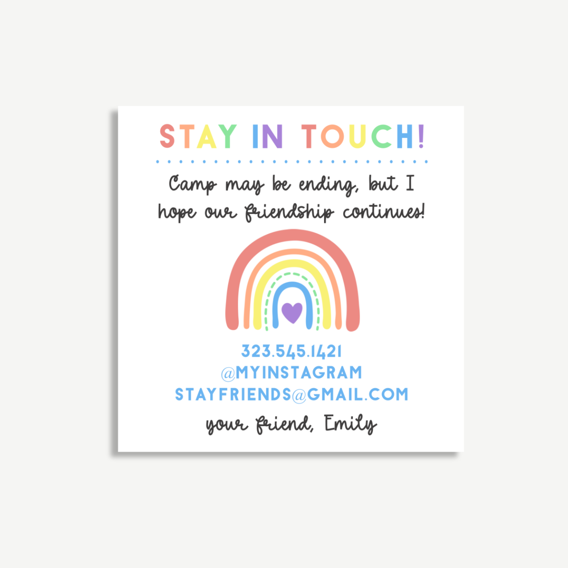 🛒 Order your Stay in Touch Camp Card – Printable Rainbow Contact Exchange for Kids – 3x3" Today!